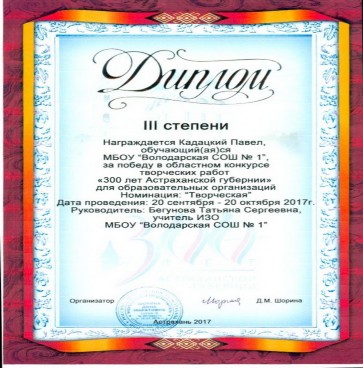 1 сентября в классах школы прошли мероприятия, посвященные 300-летию Астраханской губернии и 150-летию пос. Володарский, тематические уроки " Я талантлив", а также конкурсно-развлекательные мероприятия.