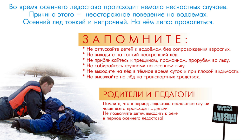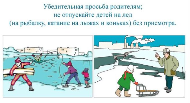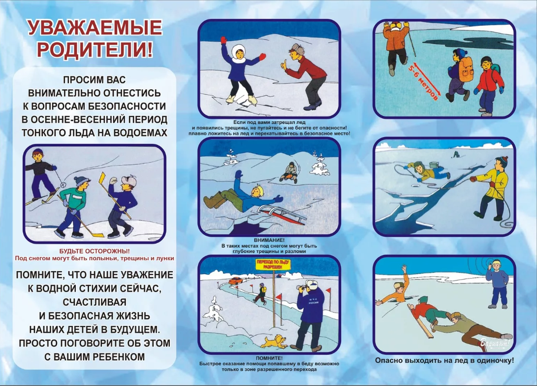 ПРАВИЛА ПОВЕДЕНИЯ НА ЛЬДУ: Ни в коем случае нельзя выходить на лед в темное время суток и при плохой видимости (туман, снегопад, дождь). Нельзя проверять прочность льда ударом ноги. При вынужденном переходе водоема безопаснее всего придерживаться проторенных дорожек. Если их нет, то внимательно осмотреться и наметить предстоящий маршрут. При переходе водоема группой необходимо соблюдать дистанцию (5-6 метров). На замерзший водоем необходимо брать с собой прочный шнур длиной 20-25 метров с большой глухой петлей на конце и грузом. Груз поможет забросить шнур к провалившемуся в воду товарищу , петля нужна для того, чтобы пострадавший мог надежнее держаться, продев ее под мышки. УВАЖАЕМЫЕ РОДИТЕЛИ, НЕ ДОПУСКАЙТЕ ДЕТЕЙ НА ЛЕД ВОДОЕМОВ (НА РЫБАЛКУ, КАТАНИЕ НА КОНЬКАХ) БЕЗ ПРИСМОТРА