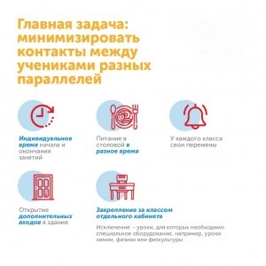 Каждый класс будет иметь свое расписание уроков и перемен, с целью минимизации контактов обучающихся (в том числе сокращения их количества во время проведения термометрии, приема пищи в столовой). Каждый урок включает динамическую паузу (5-10 минут). Часть уроков и внеурочная деятельность будут проходить в дистанционном режиме (смешанное расписание) один день в неделю.