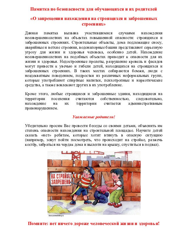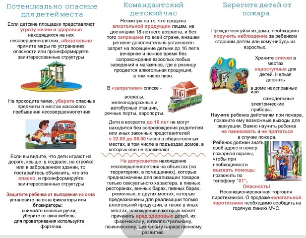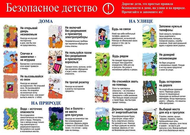 Уважаемые родители! Летом, с началом каникул, наших детей подстерегает повышенная опасность на дорогах, у водоемов, в лесу, на игровых площадках, в саду, во дворах. Этому способствует погода, летние поездки и любопытство детей, наличие свободного времени, а главное отсутствие должного контроля со стороны взрослых. Чтобы дети были отдохнувшими, здоровыми и живыми надо помнить ряд правил и условий при организации их отдыха с родителями, родственниками, друзьями (на даче или в деревне у бабушки): формируйте у детей навыки обеспечения личной безопасности; проведите с детьми индивидуальные беседы, объяснив важные правила, соблюдение которых поможет сохранить жизнь; решите проблему свободного времени детей; помните! Поздним вечером и ночью (с 22 до 6 часов местного времени) детям и подросткам законодательно запрещено появляться на улице без сопровождения взрослых; постоянно будьте в курсе, где и с кем ваш ребенок, контролируйте место пребывания детей; не разрешайте разговаривать с незнакомыми людьми. Объясните ребенку, что он имеет полное право сказать «нет» всегда и кому угодно, если этот «кто-то» пытается причинить ему вред; объясните детям, что ни при каких обстоятельствах нельзя садиться в машину с незнакомыми людьми; убедите ребенка, что вне зависимости от того, что произошло, вы должны знать о происшествии, ни в коем случае не сердитесь, всегда примите его сторону. Объясните, что некоторые факты никогда нельзя держать в тайне, даже если они обещали хранить их в секрете; плавание и игры на воде кроме удовольствия несут угрозу жизни и здоровью детей. Когда ребенок в воде, не спускайте с него глаз, не отвлекайтесь - подчас минута может обернуться трагедией; обязательно объясните детям, что они не должны купаться в одиночку, а также нырять в незнакомом месте; взрослый, который присматривает за купающимися детьми, должен сам уметь плавать, оказывать первую помощь, владеть приемами проведения искусственного дыхания и непрямого массажа сердца; чтобы не стать жертвой или виновником дорожно-транспортного происшествия, обучите детей правилам дорожного движения, научите их быть предельно внимательными на дороге и в общественном транспорте; проявляйте осторожность и соблюдайте все требования безопасности, находясь с детьми на игровой или спортивной площадке, в походе; изучите с детьми правила езды на велосипедах, скутерах, мопедах, мотоциклах. Помните! Детям, не достигшим 14 лет, запрещено управлять велосипедом на автомагистралях и приравненных к ним дорогам, а детям, не достигшим 16 лет, скутером (мопедом ). Будьте предельно осторожны с огнем. Обратите внимание детей на наиболее распространенные случаи пожаров из-за неосторожного обращения с огнем: детская шалость с огнем; непотушенные угли, шлак, зола, костры; незатушенные окурки, спички; сжигание мусора владельцами дач и садовых участков на опушках леса; поджог травы, короткое замыкание, эксплуатация электротехнических устройств, бытовых приборов, печей. Помните, что от природы дети беспечны и доверчивы. Внимание у детей бывает рассеянным. Поэтому, чем чаще вы напоминаете ребенку несложные правила поведения, тем больше вероятность, что он их запомнит и будет применять. Вы должны регулярно их напоминать. Сохранение жизни и здоровья детей - главная обязанность взрослых. Пожалуйста, сде