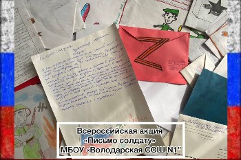 Ученики МБОУ «Володарская СОШN1” приняли участие во Всероссийской акции « Письмо солдату». Ребята обратились от своего имени с теплыми словами поддержки ко всем тем, кто сейчас участвует в спецоперации.В своих письмах школьники выражали искреннюю признательность и благодарность нашим героям, пожелали бойцам успешного выполнения боевых задач, а также скорейшего возвращения домой. В акции приняли участие ученики 1-11 классов. Надеемся, что эти добрые слова ребят смогут поднять боевой дух наших военных и придадут им сил.