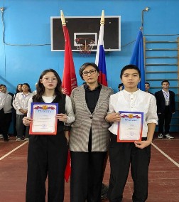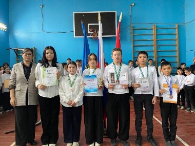 Призеры олимпиады: ученик 8 «Б» класса Сапахов Ильяс, ученица 6 «Б» класса Токбаева Амалия, ученик 6 «А» класса Джумартов Мансур, ученица 6 «В» класса Кожалиева Дарина.
