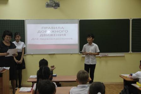 Месячник безопасности жизнедеятельности обучающихся. Учащиеся 5 "А" класса под руководством классного руководителя Калимбетовой Ф.С. подготовили мероприятие для 1 "А" класса ( классный руководитель Мухамеджанова С.Б.) "Выучи правила дорожного движения как таблицу умножения ", а так - же изготовили памятки о соблюдении правил дорожного движения для первоклассников.