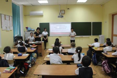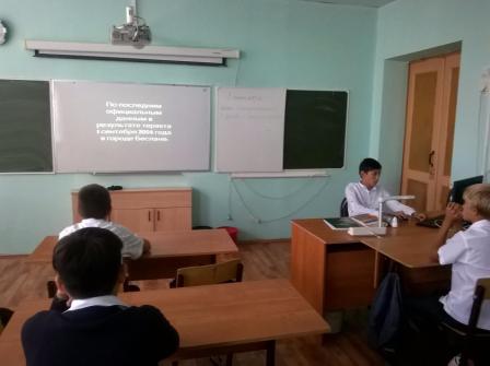 В рамках месячника безопасности жизнедеятельности учащиеся 8 "А" класса ( классный руководитель Кадыржанова А.В.) подготовили мероприятие для 3 "Б" класса ( классный руководитель Джамалидинова А.С.) "МЫ - ПРОТИВ экстремизма и терроризма".Учащиеся 8 "А" класса изготовили памятки по противодействию экстремизму и терроризму и о правилах поведения во время террористических актов.