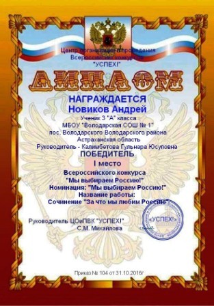 Учащиеся 3 "А" класса Новиков Андрей и Наушаева Динара ( классный руководитель Калимбетова Г.Ю.) стали победителями Всероссийского конкурса "Мы выбираем Россию! "